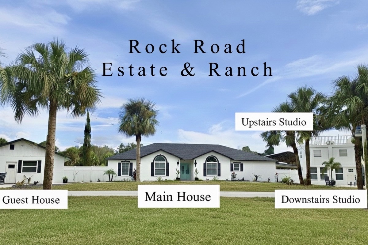 Rock Road Estate & Ranch is a unique multi-unit property perfect for families and groups traveling together. The left side features a private 2-bedroom, 1-bath Guest House, the center is the spacious 4-bedroom, 3-bath Main House with a pool, and the right side includes two separate studio apartments — one upstairs and one downstairs. Each unit is fully private, making it perfect for friends and extended family who want to stay close while enjoying their own space.